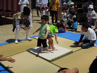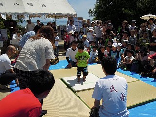 さっそく取り組みが始まります。小さな子供にとっては初めての尻相撲!熱い視線の中、真剣勝負に挑みます。