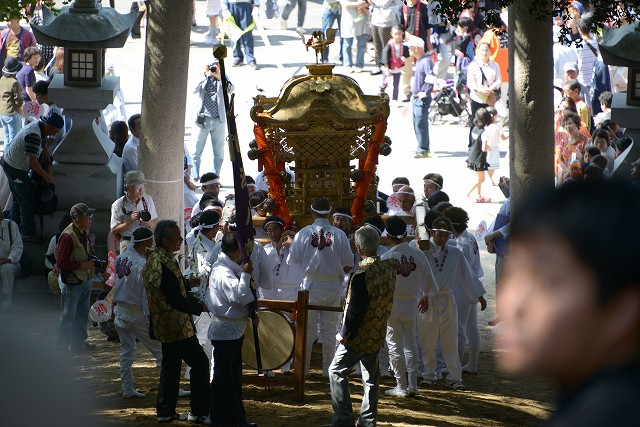 お旅所祭を終え、参道近くに帰還した御神輿は、参道を担ぎ上げるための準備をします。準備中に伊藤市長が応援に駆けつけてくださいました。
