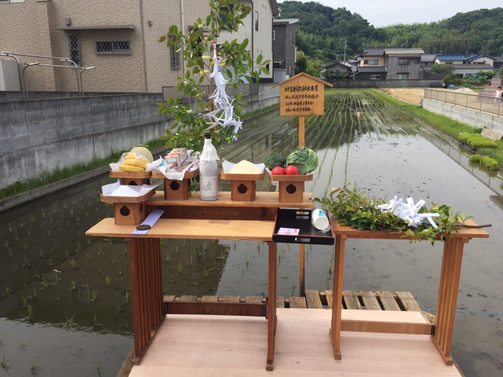 田んぼの上に特設祭壇が準備され、羽黒神社福田宮司により御田植祭が斎行されました。