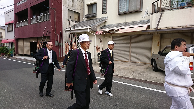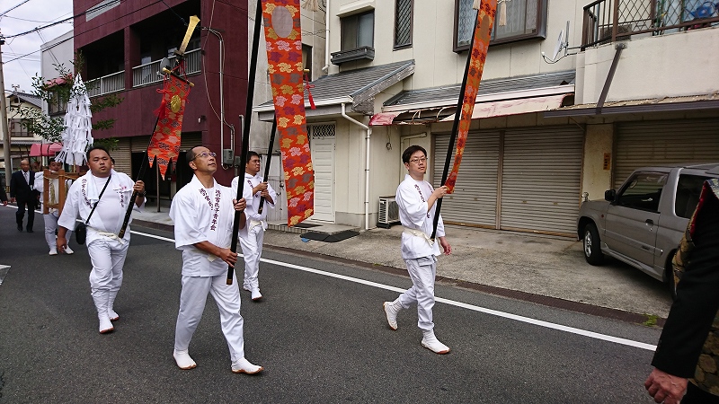 社名旗を掲げるのは難波秋祭委員長