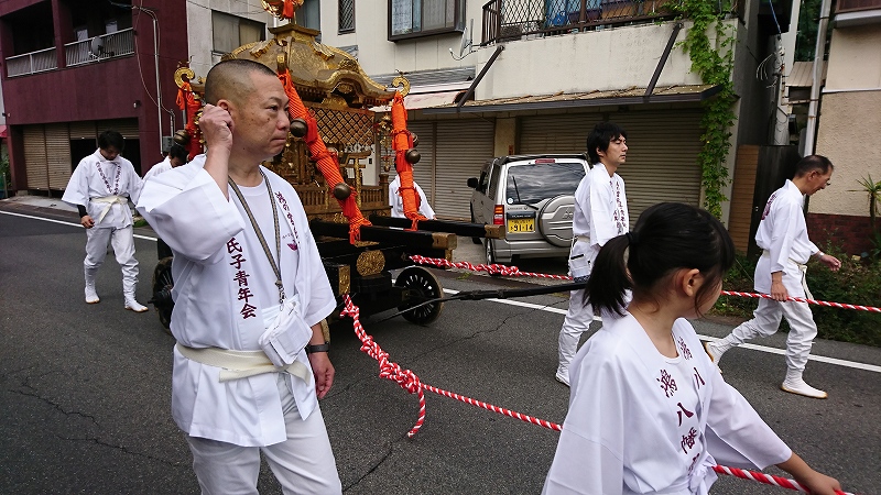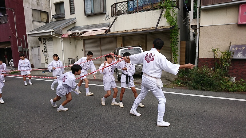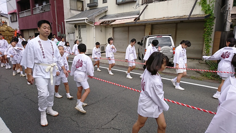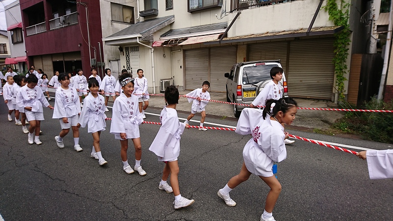 元気いっぱいの曳き子たち。今日は歩行者天国ですが、怪我には気を付けて。