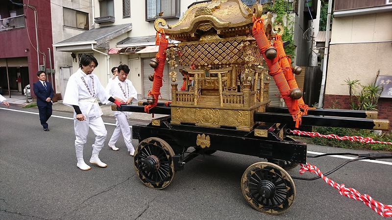 御神輿が拝殿から台車の上に移されました。これから御神幸に出発です。