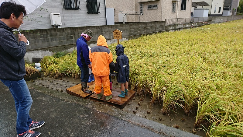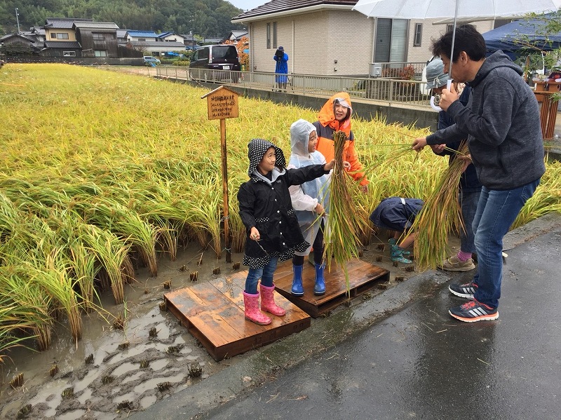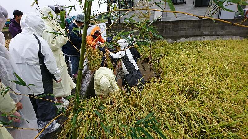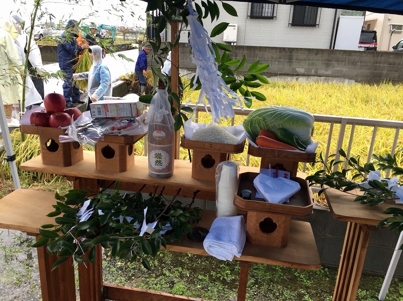 抜穂祭(神宮献米事業) 更新日:2021年6月24日 公開日:2017年10月29日 行事祭典 平成29年10月29日 神宮新穀献米事業の抜穂祭が羽黒神社氏子青年会渡辺氏の斎田にて斎行されました。 待望の抜穂祭ですが台風による大雨です。臨時のテントの中で羽黒神社福田宮司がなんとか準備をしてくださいました。 氏子の子供達にとって、初体験の稲刈りです。しっかり説明を受けて 鎌を持ってザクっと 奇麗に切れました。 今年は玉島高校の皆さんも参加してくださいました。 この事業で少しでも次世代にお米作りの大切さを伝える事が出来たなら幸いです。 タグ 神宮新穀献米事業 関連記事 御神輿出倉夏越大祓祭元旦行事岡山県神社関係者大会秋季例大祭七五三 交通整理及び警備 投稿ナビゲーション 秋季例大祭(御神幸)注連縄研修