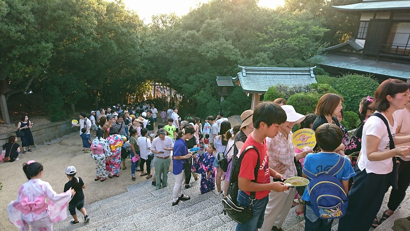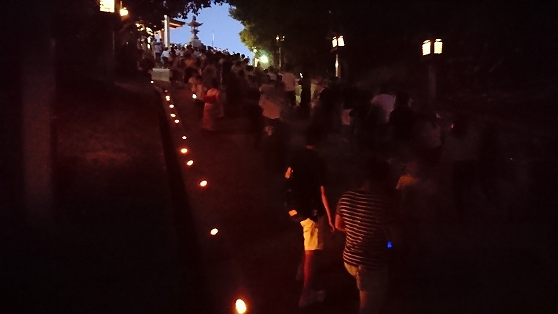辺りが暗くなり、参道の竹灯籠に明かりが灯されます。琴浦高等支援学校の生徒さんが一生懸命作った灯籠が、暗い参道を暖かく照らしています。