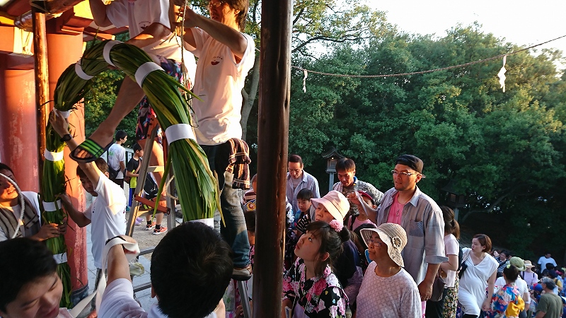 宮司の大太鼓の合図で茅の輪が氏子青年会の手により取り付けられます。