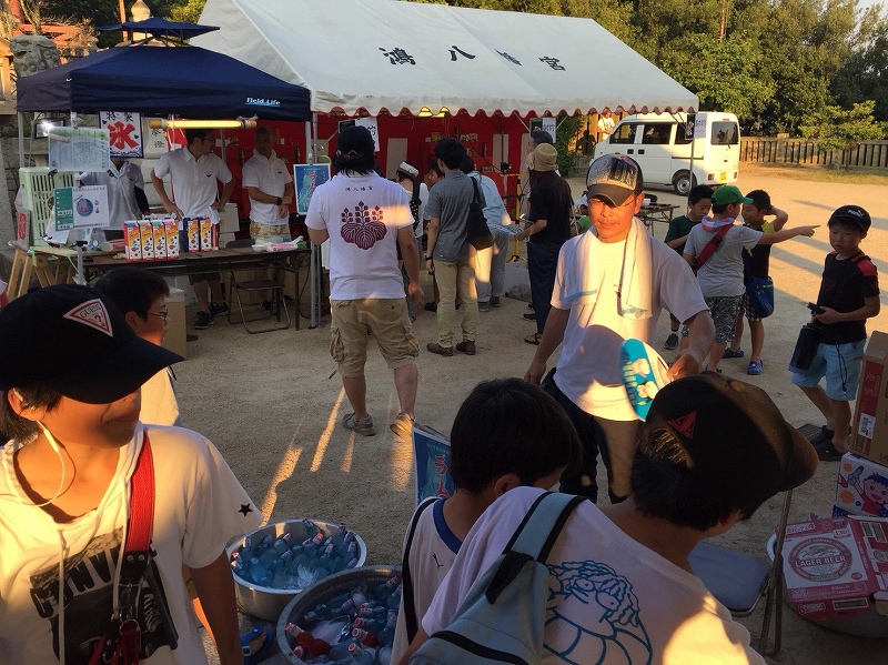 15時より境内にて準備が始まります。猛烈な暑さの中、汗まみれになりながらの作業です。