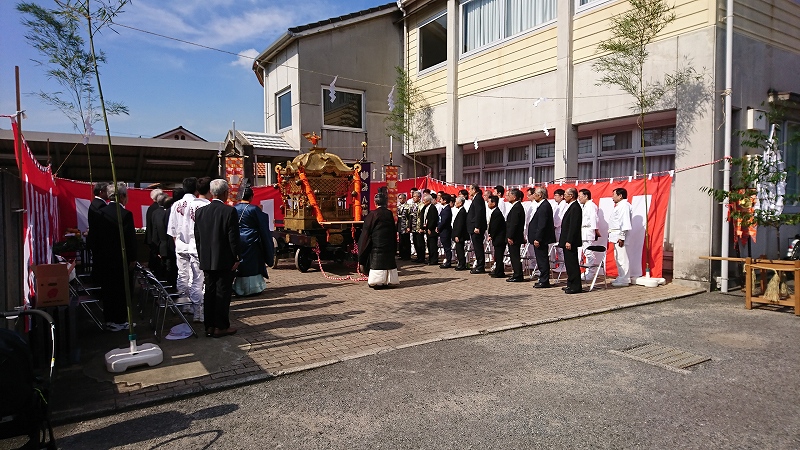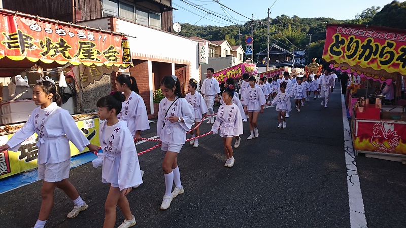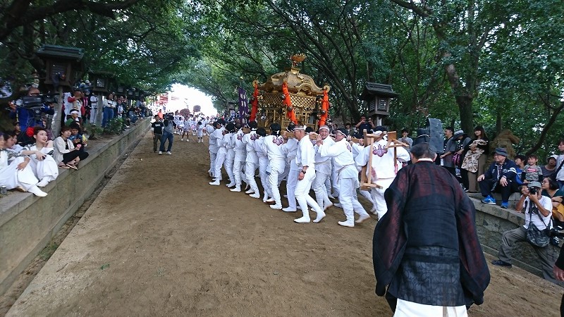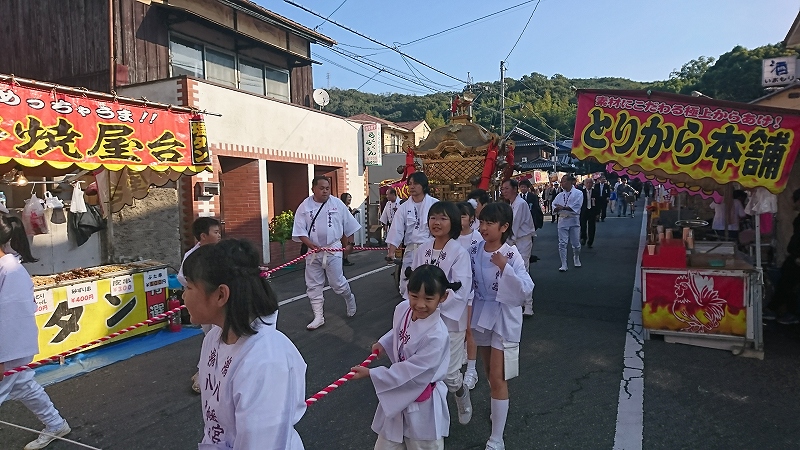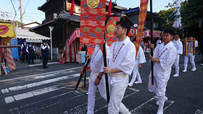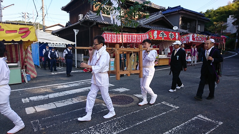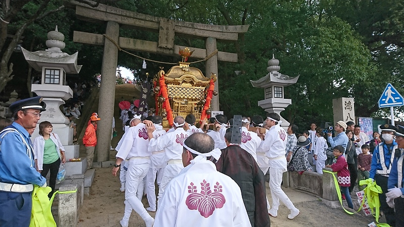 閑井染工場様で台車から降ろされたお神輿に担ぎ棒が取り付けられます。ここからは氏子青年会に担がれて境内へ帰還します。伊東かおり倉敷市長が応援に駆けつけてくれました。
