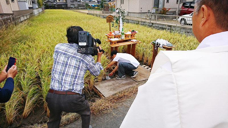 御神田に特設の祭壇が設けられ、羽黒神社氏子青年会、鴻の宮氏子青年会及び関係者、参加者が整列し祭典を行います。